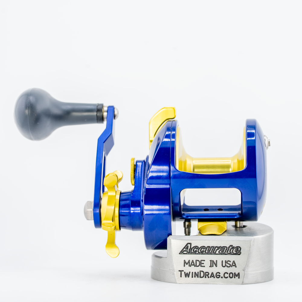 Custom Color Tern2 500X in Purple-Blue/Yellow Anodizing. This is a high-speed, right-handed reel. Reel specs can be found here.