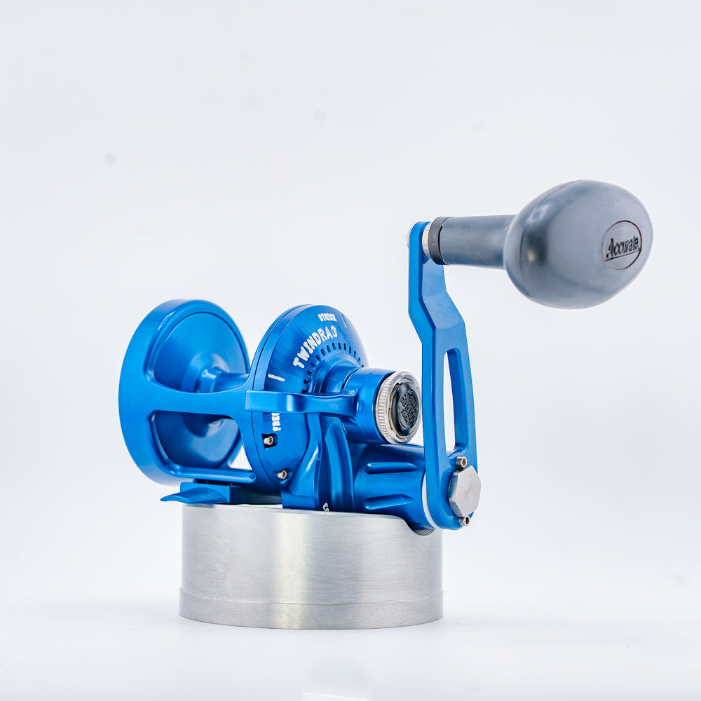 Custom Color Valiant 400 in Blue Anodizing. This is a single-speed, right-handed reel.