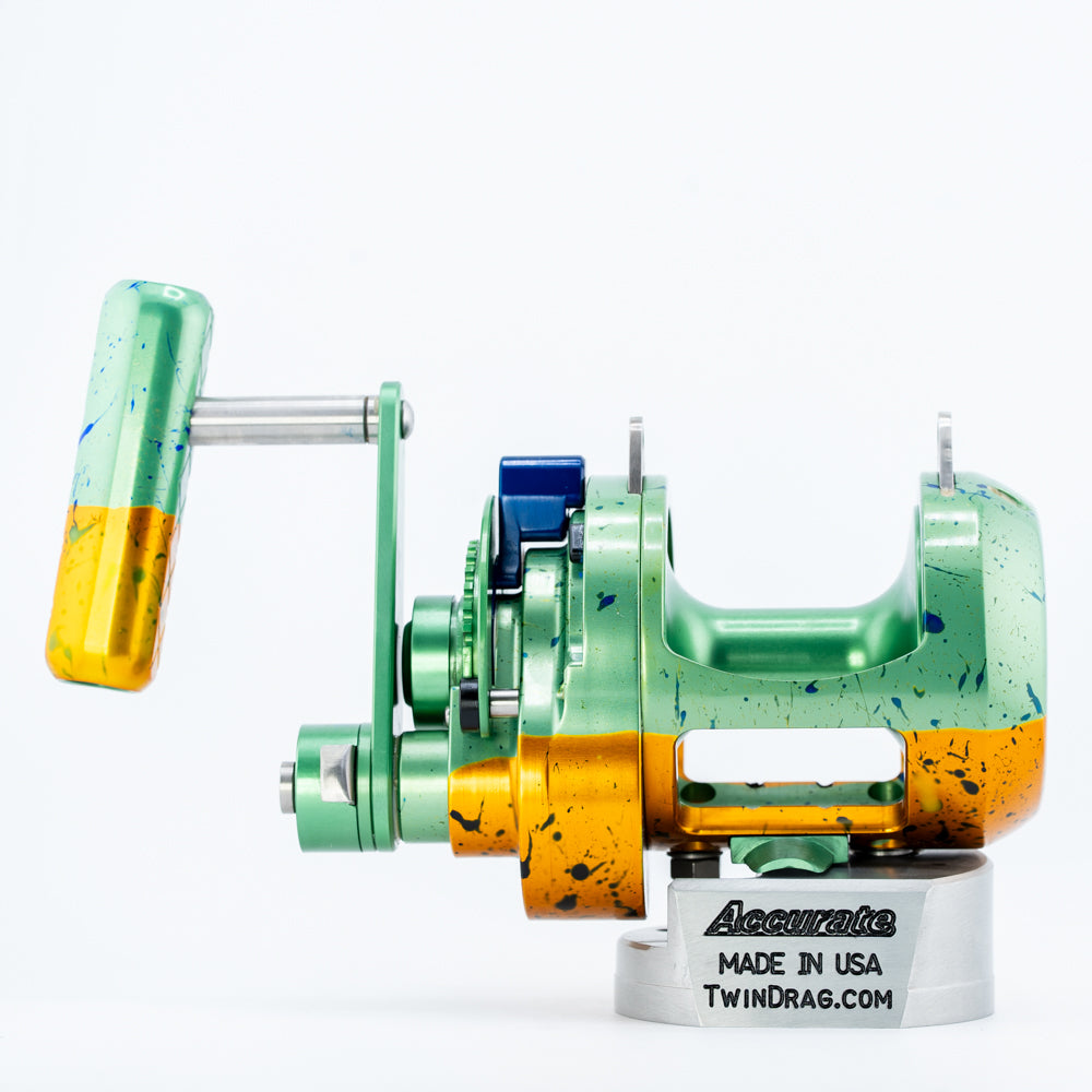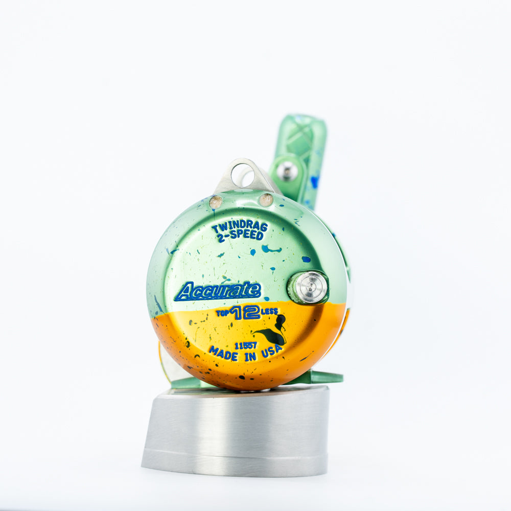 Mahi ATD 12T in Custom Anodizing. This is a 2-speed, right-handed reel. Reel specs can be found here.