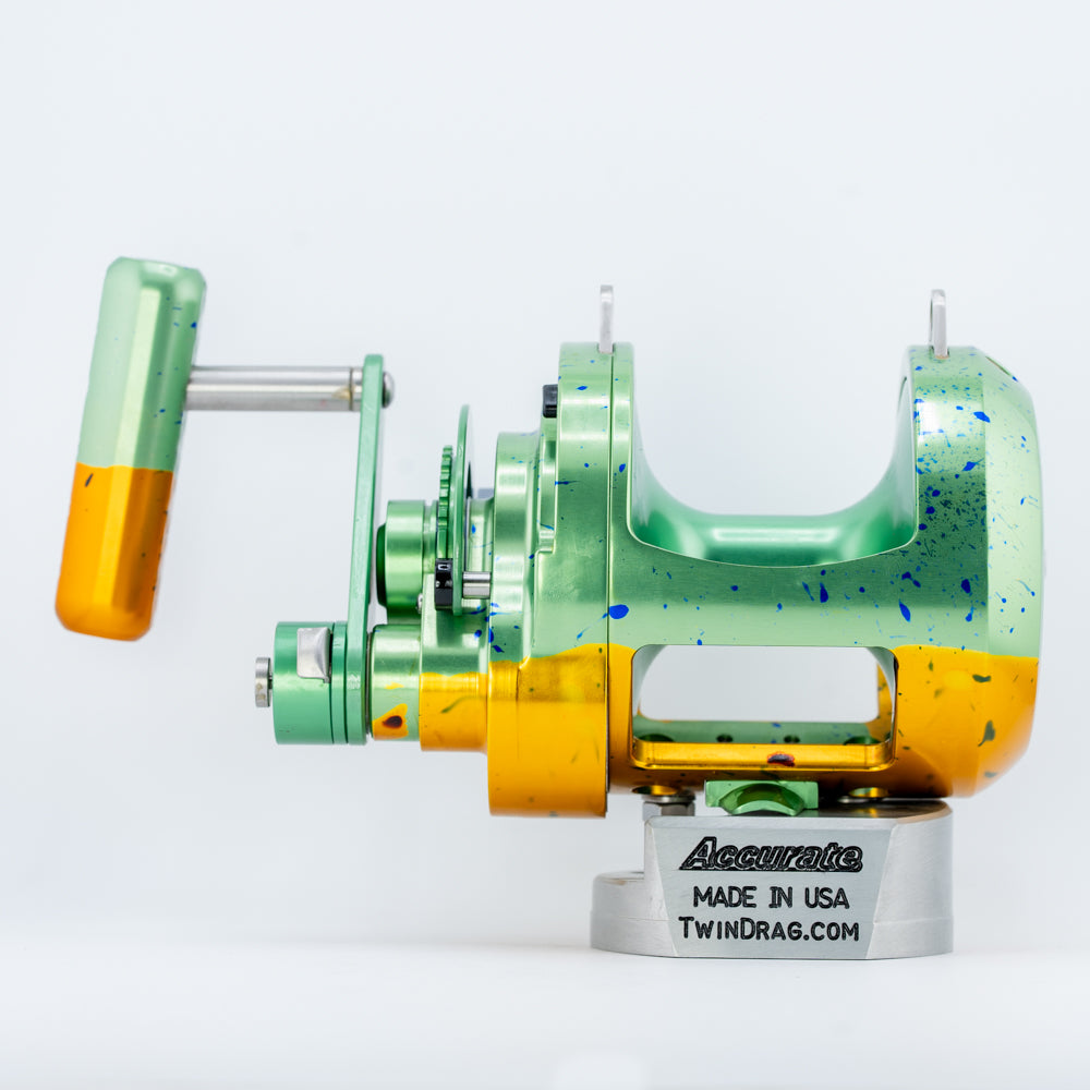 Custom Color ATD 50T in "Mahi" Anodizing. This is a 2-speed, right-handed reel. Reel specs can be found here.