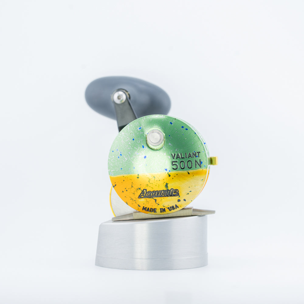 Custom Color Valiant 500N in Mahi/Black/green Anodizing. This is a 2-speed, right-handed reel.