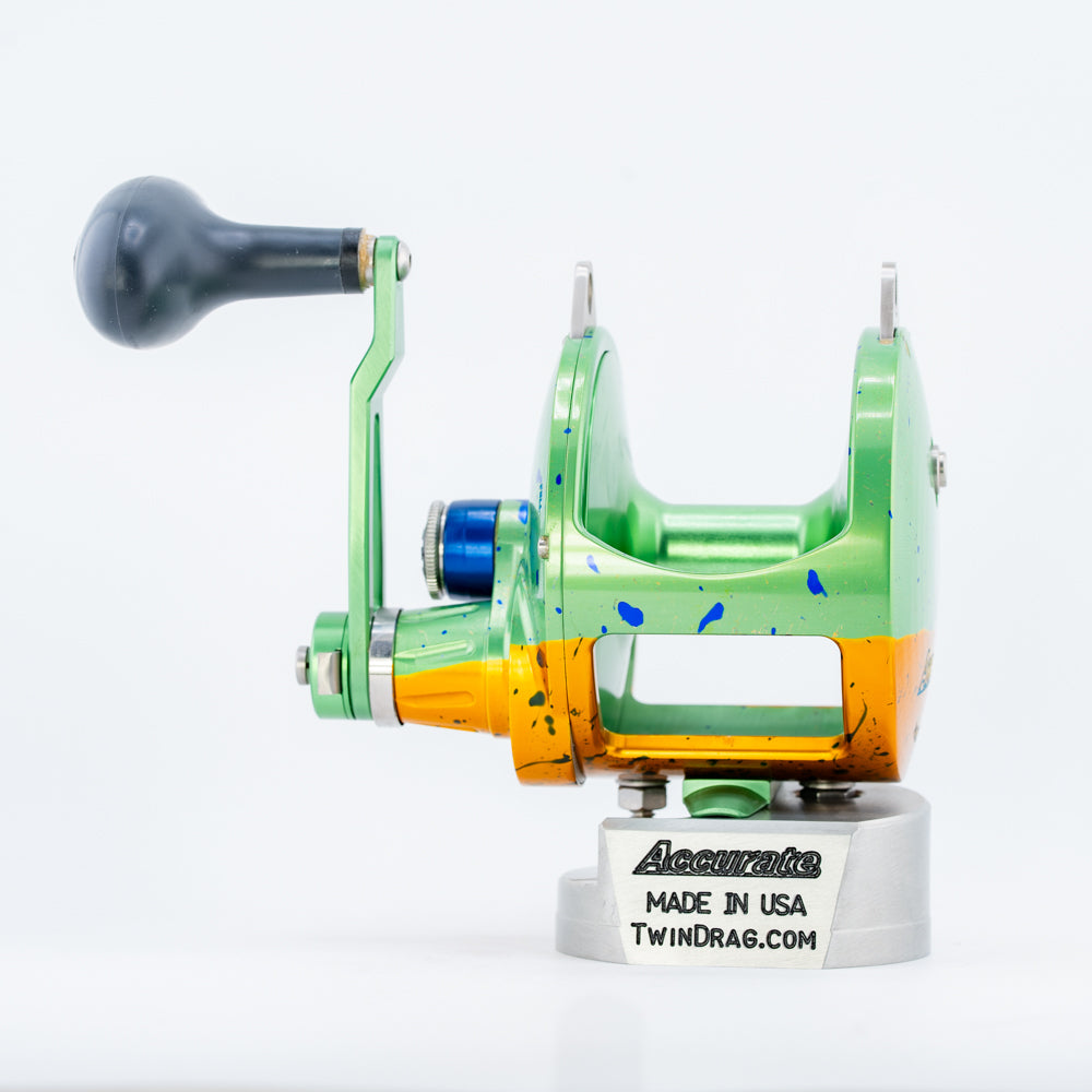 This reel is the dopest dope, I’ve ever smoked. Love how light it is, how compact it is, the amount of line I can fit on here is insane (400yrds+ of PE2 Nomad Ammonite). Really love the extended handle that comes with my model too. The drag on this guy is no joke either, it’ll bite down the full 30lbs if you’re looking to party…and remain smooth too. The hype is reel with Accurate (lol see what I did there). I sprung for the custom color. I chose Mahi, even though it was my second choice. Not getting into the details, but if you want custom work, and it’s not on their website, or on an authorized dealers shelf, there’s a process. That being said, despite being my second choice, the paint makes the reel look as good as it performs. Everyone who has laid eyes on this thing is blown away. I love that these are custom, and no two are the same. I say that cause the person who made mine was feeling the blue splatter especially heavy on that day compared to others lol. There’s blue streaks on mine from the paint dripping down off it.