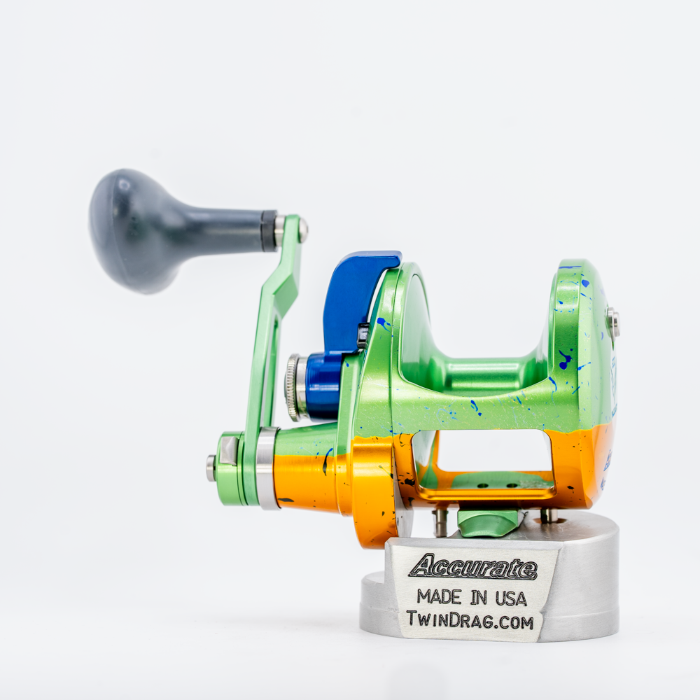 Custom Color Valiant 2 600 in Mahi Custom Anodizing. This is a 2-speed, right-handed reel. Reel specs can be found here.