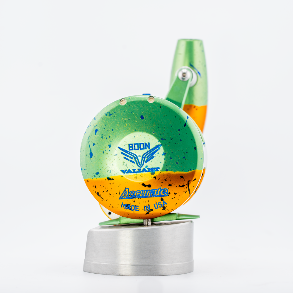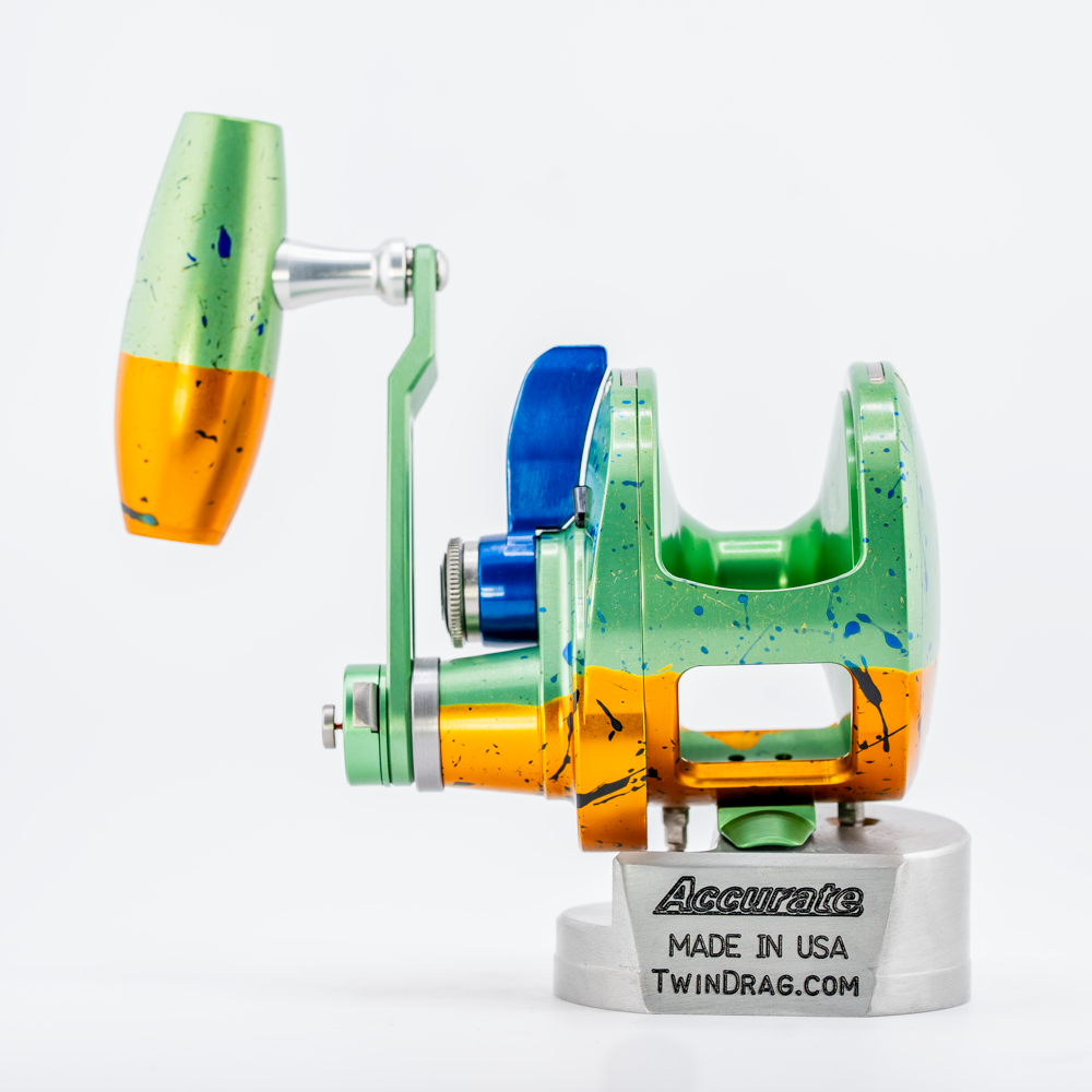 Custom Color Valiant 2 800N SPJ in Mahi Custom Anodizing. This is a 2-speed, right-handed reel. Reel specs can be found here.