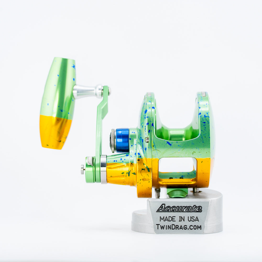 Custom Color Valiant 800N in "Mahi" Anodizing. This is a 2-speed, Slow-pitch Jigging right-handed reel.
