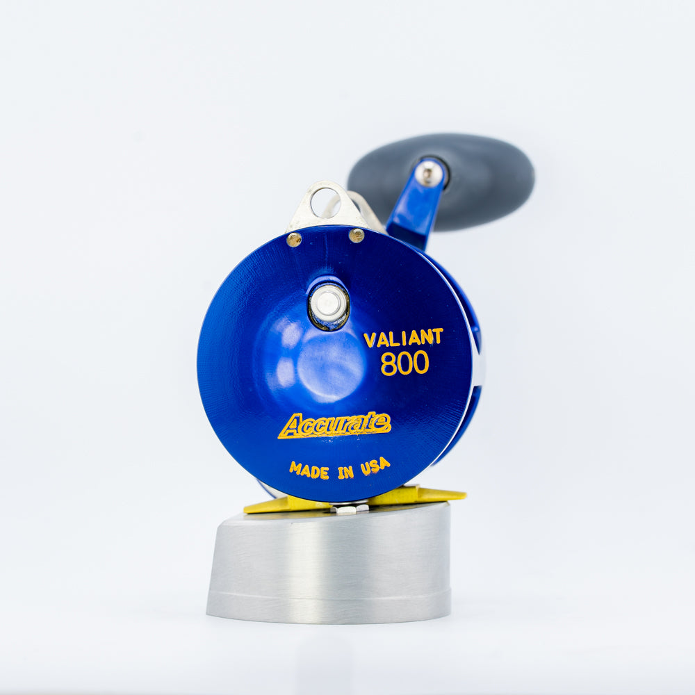 Custom Color Valiant 800 in Purple/Blue/Yellow Anodizing. This is a 2-speed, right-handed reel.