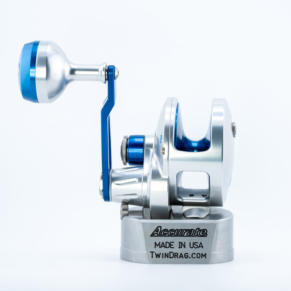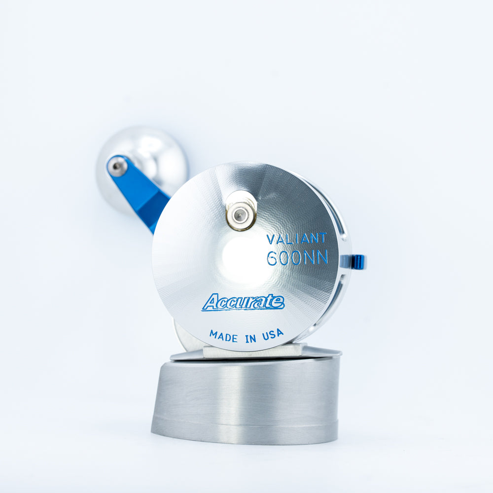 Custom Color Valiant 600NN in Silver/Blue Anodizing. This is a single-speed, right-handed reel.