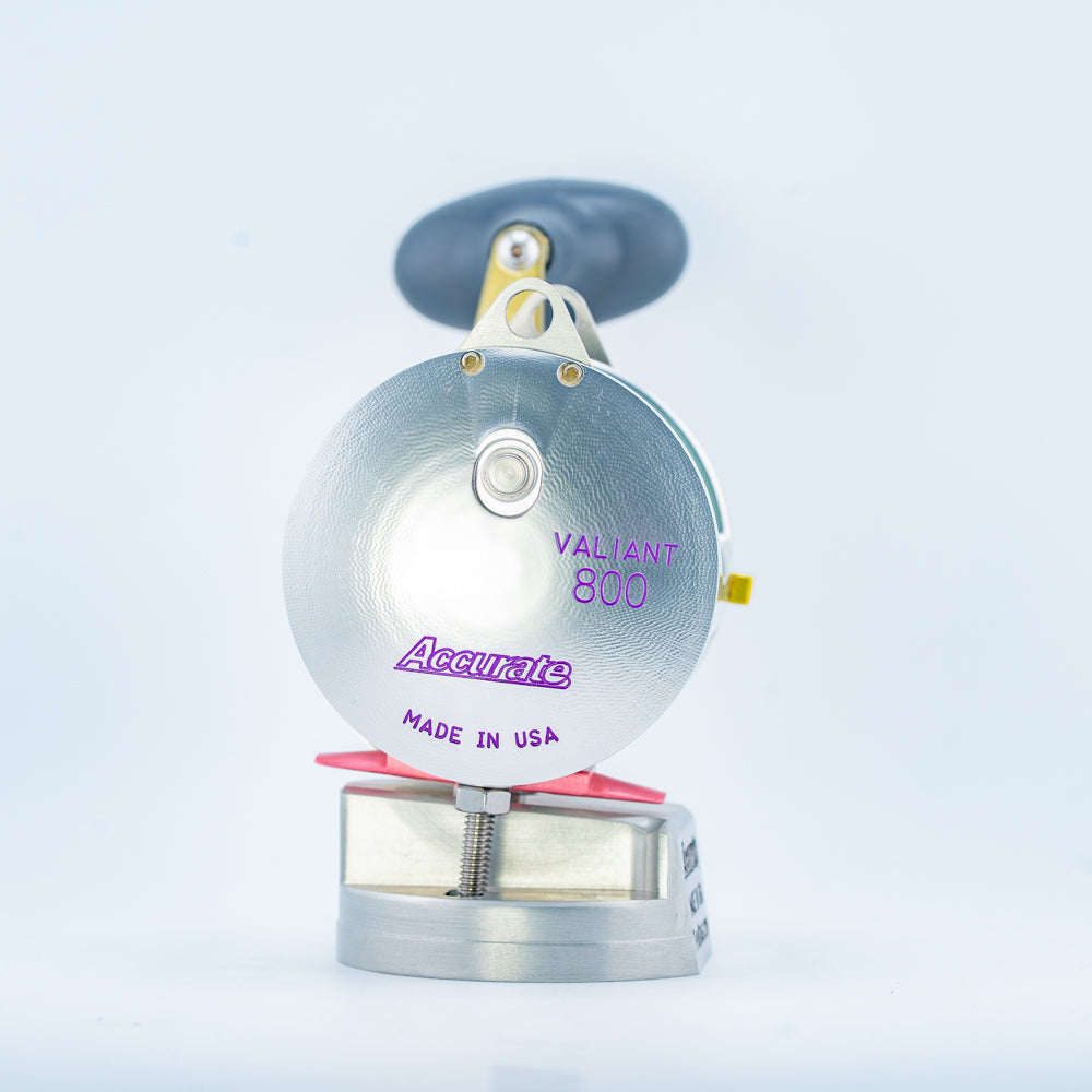 Custom Color Valiant 800 in Silver/Multi Color Anodizing. This is a 2-speed, right-handed reel.