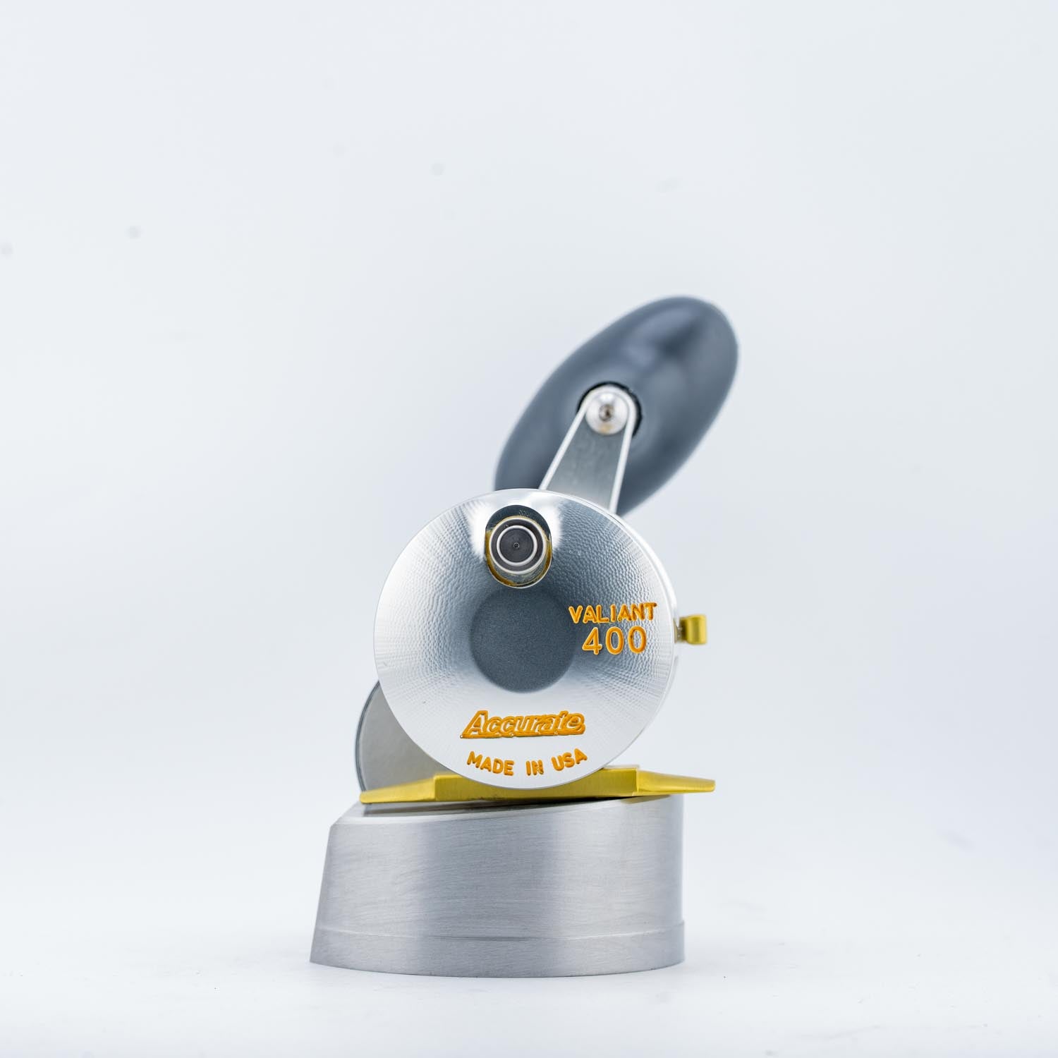 Custom Color Valiant 400 in Silver/Yellow Anodizing. This is a single-speed, right-handed reel.